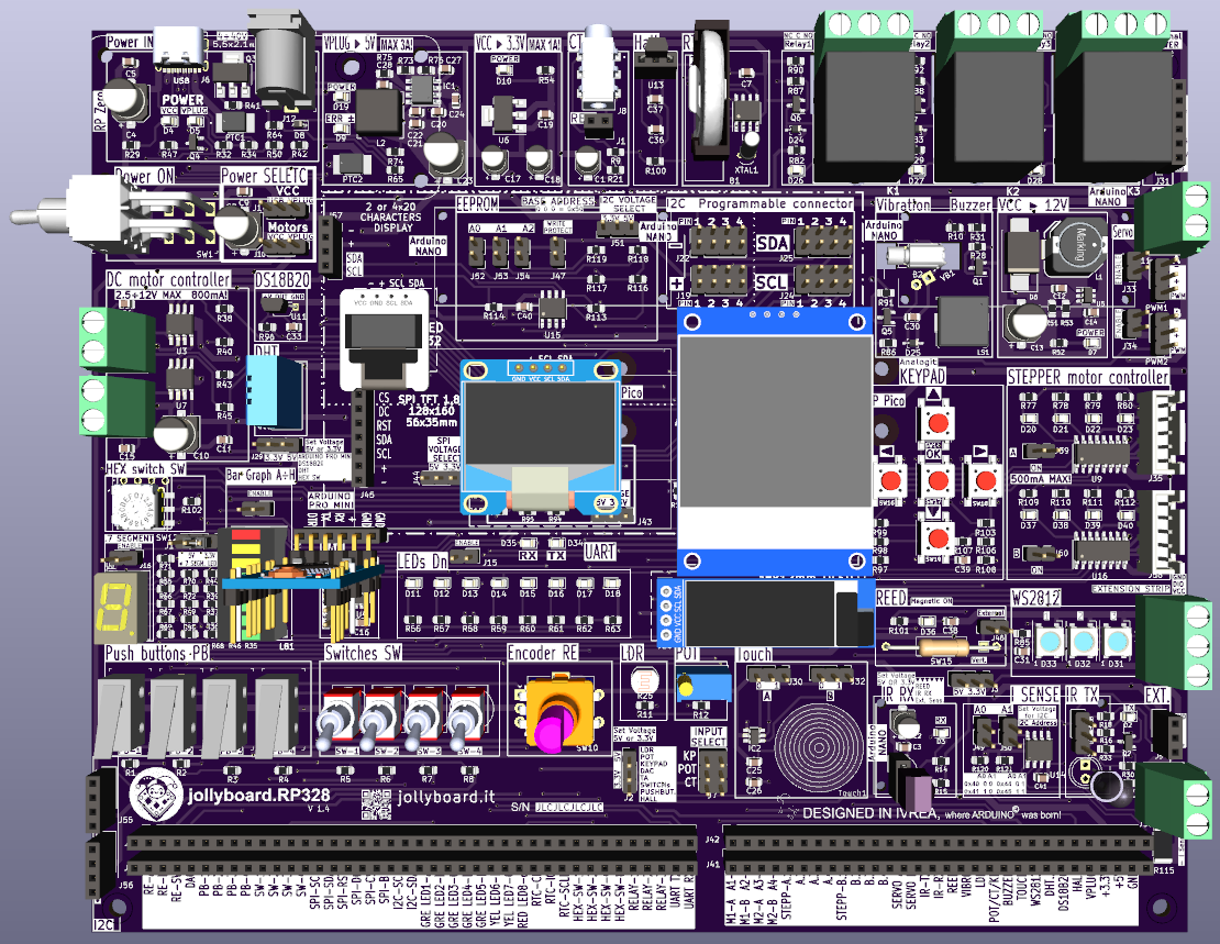 La JollyBoard.RP328 è una scheda di espansione avanzata che concentra in un unico supporto le funzionalità di numerosi dispositivi comunemente presenti nelle breakout board, semplificando la prototipazione e lo sviluppo di progetti elettronici.
